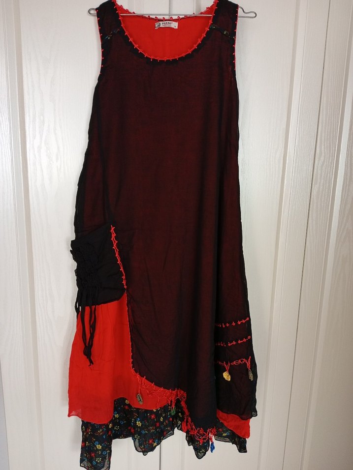 Koyu kırmızı desenli, uzun ve kolsuz, salaş kesim bohem tarzda elbise Yuvarlak yakalı ve günlük kullanıma uygun.Boy 115 cm