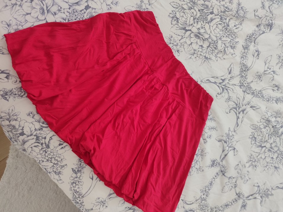 Kırmızı, salaş kesim, drapeli hamile midi eteği, yumuşak sentetik kumaştan, açık hava kullanımı için uygun.