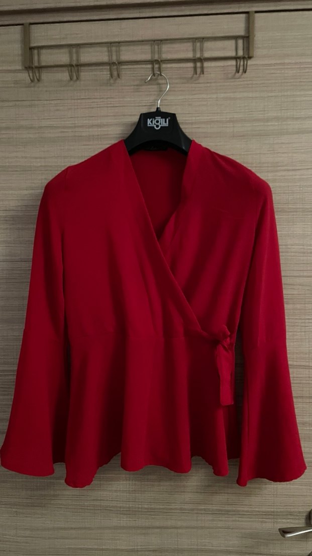 kırmızı kadın bluz, yakalı ve uzun kollu. İpek gibi kumaştan, salaş kesim ve drapeli tasarıma sahip, özel günler için şık ve rahat. ✨