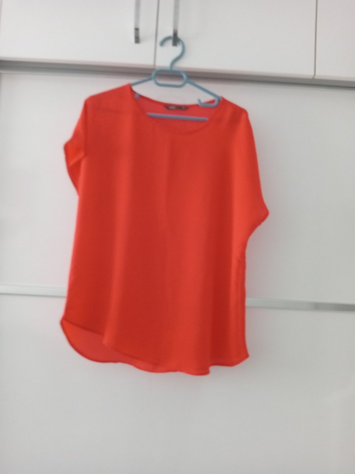 Kırmızı renkte, kısa kollu, salaş kesim ve yuvarlak yakalı bluz. Sentetik kumaştan, drapeli ve midi boyda, günlük kullanıma uygun.