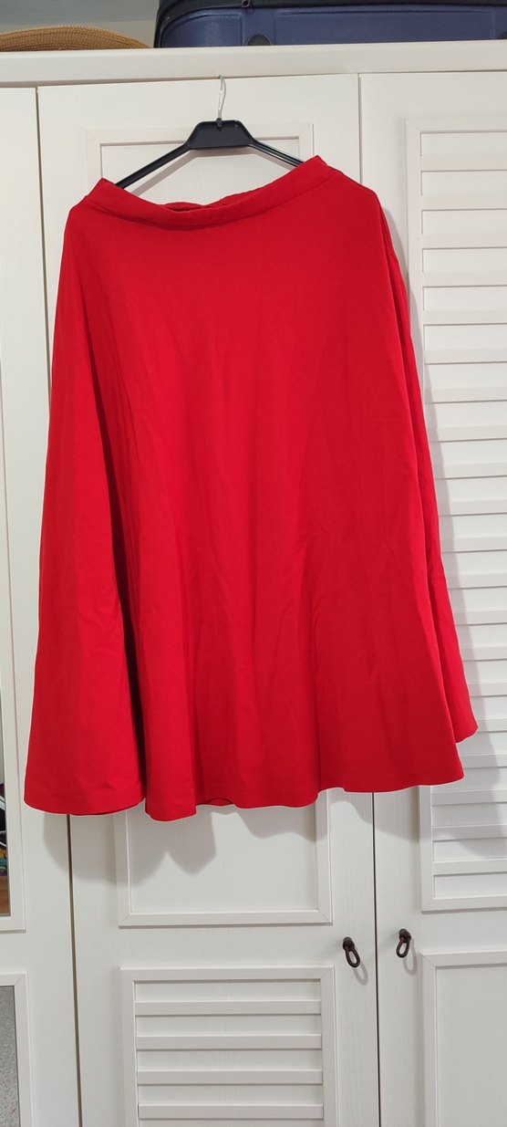Kırmızı midi uzunlukta, salaş kesim ve drapeli tasarıma sahip etek. Yumuşak, sıcak kumaştan yapılmıştır ve parlak görünüme sahiptir.