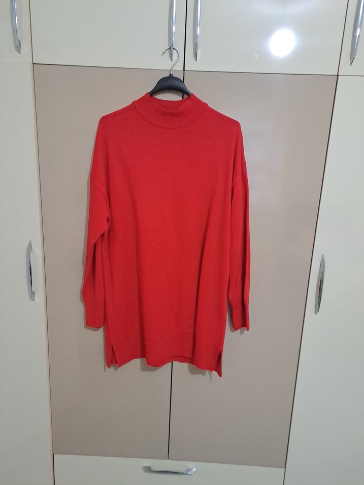 Kırmızı renkli, örgü dokulu, yuvarlak yaka ve uzun kollu kadın kazak. Salaş kesim, midi boyda, yumuşak ve sıcak kumaştan üretilmiştir.
