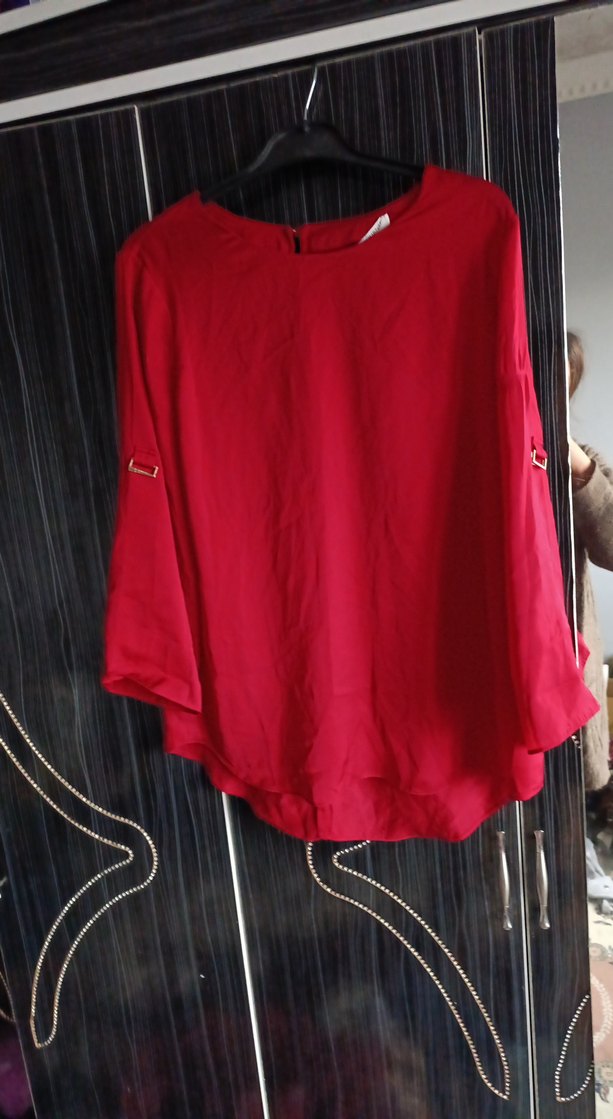 Kırmızı, uzun kollu, salaş kesim bluz. Parlak sentetik kumaştan, drapeli tasarıma sahip, günlük sokak stili için uygun. ✨