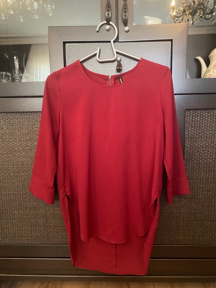 Kırmızı, salaş kesim, yuvarlak yakalı ve uzun kollu bluz. Arkası fermuarlıdır. Bedeni s fakat geniştir, m bedenlerde rahatlıkla kullanabilir.