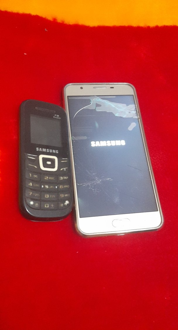 Ekranı çatlak koyu kırmızı Samsung Android telefon ve yanında klasik siyah Samsung tuşlu telefon. samsung j7 prime 2 sinin fiyatıdır