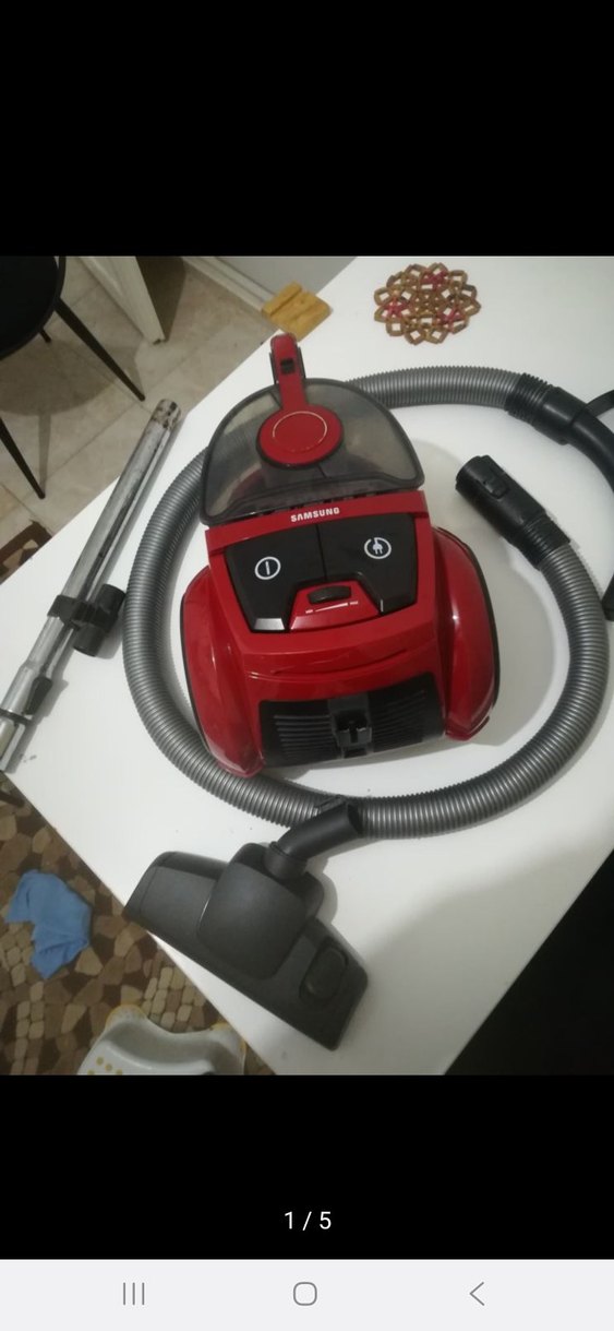 Kırmızı gövdesi ve gri hortumu olan Samsung elektrikli süpürge, ayarlanabilir başlıklarla çeşitli temizlikler için uygundur. Kompakt ve kullanımı kolay.