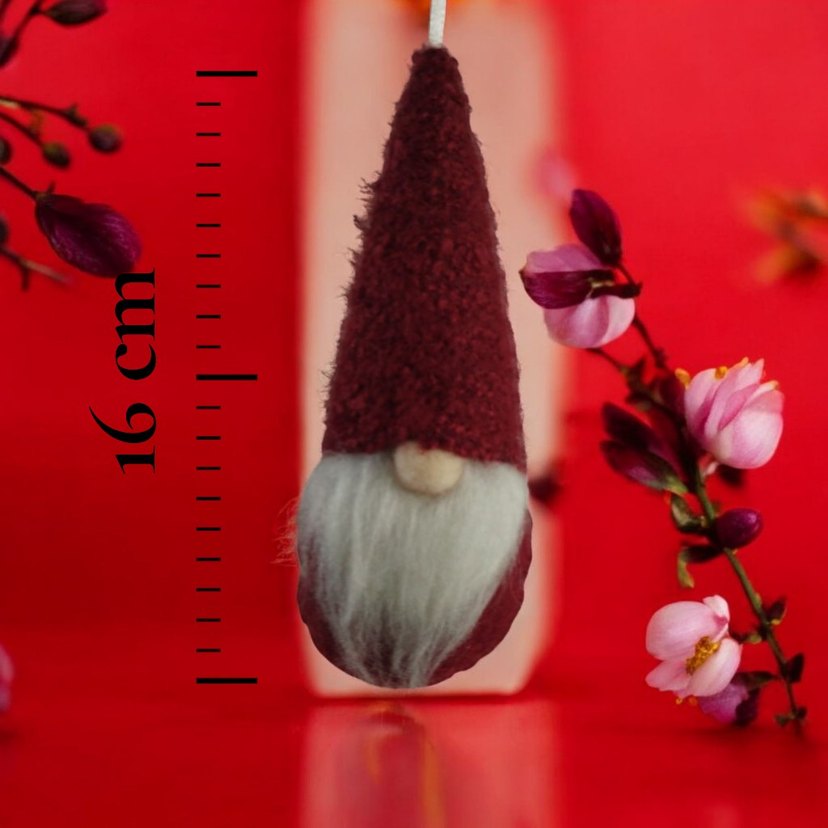 16 cm boyunda, yumuşak dokulu kırmızı şapkalı ve beyaz sakallı cüce figürin. Renkli ve dekoratif bir öğe.