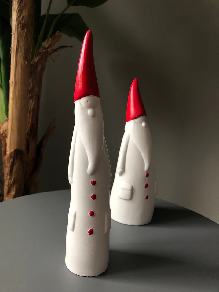 İki beyaz figürinden oluşan set, uzun kırmızı şapkalar ve düğme detaylarıyla minimalist tasarıma sahip. Ürünü geçen sene yılbaşı dekorum için aldım fakat her sene farklı konsept dekor yaptığım için satıyorum. Ürün el yapımı seramik boyamadır. Temizdir herhangi bir defosu bulunmamaktadır. İkili satıyorum fakat tek tek almak isteyen olursa o şekilde de tekli fiyatıyla da alabilrsiniz. 23 cm ve 20 cm ölçülerindedir. 23 cm tekli fiyatı 250 tl 20 cm olanın fiyatı 150 tl dir.