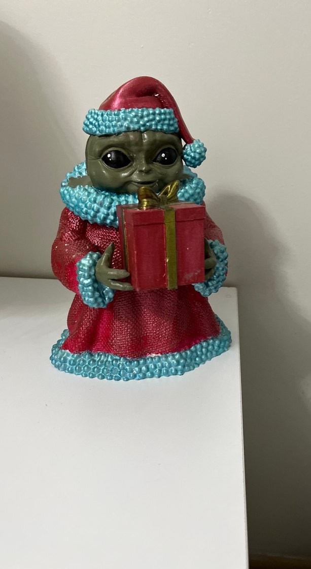 Kırmızı ve mavi detaylı kıyafet giymiş, elinde altın kurdeleli kırmızı hediye kutusu tutan gri figür. Büyük siyah gözlere sahip.