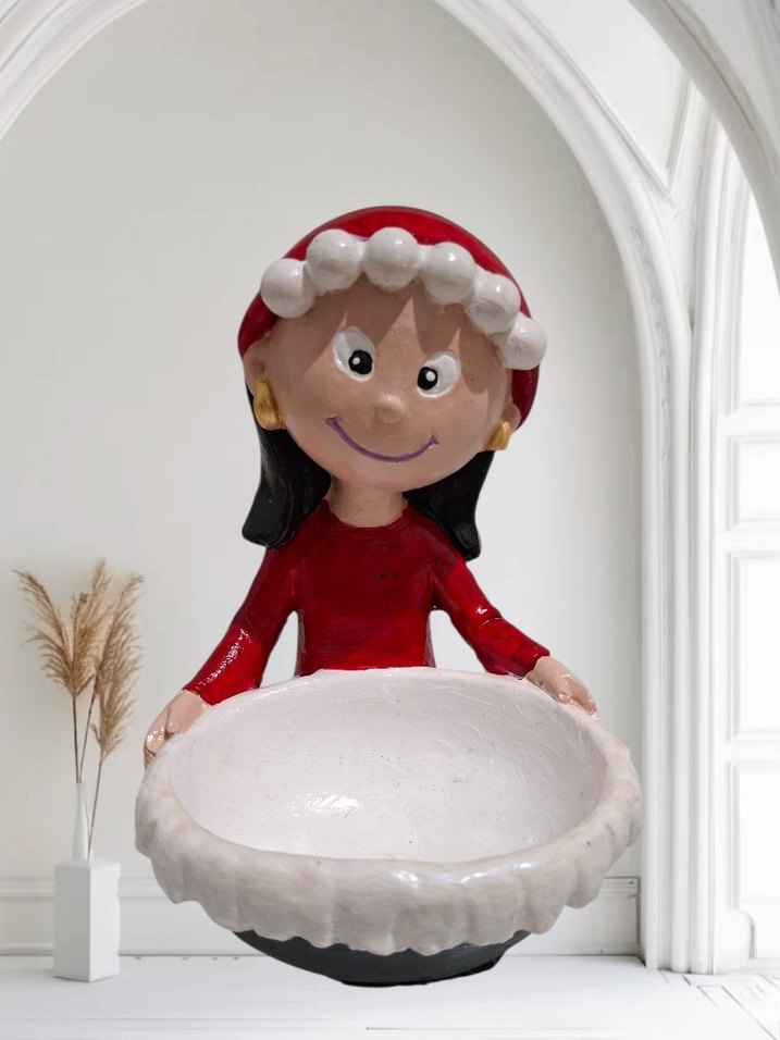 Kırmızı şapka ve elbise giymiş renkli figürin, dalgalı kenarlı beyaz bir kase tutuyor. Mekâna neşeli bir dokunuş katar. 12 cm
