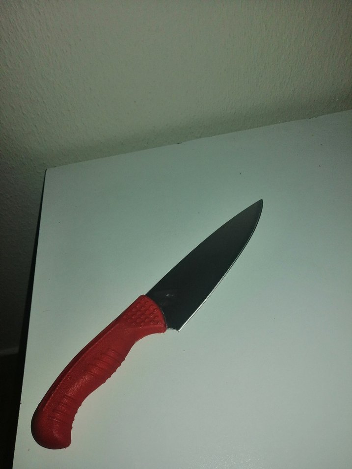 Kırmızı dokulu sapı ve aynalı bıçağı olan, rahat tutuş sağlayan bıçak.