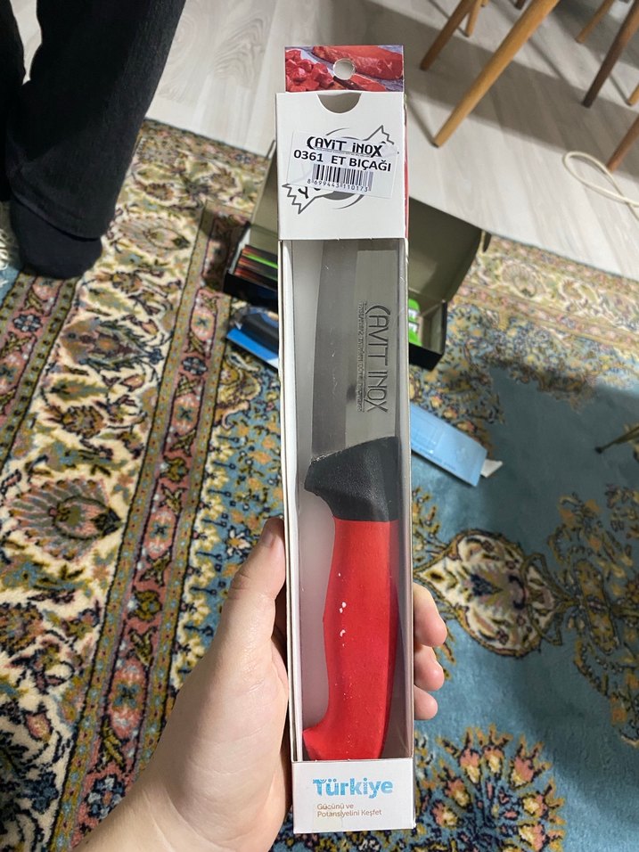 Keskin paslanmaz çelik bıçağa ve koyu kırmızı tutacağa sahip et bıçağı. Türkiye'de üretilmiştir, rahat kesim sağlar.