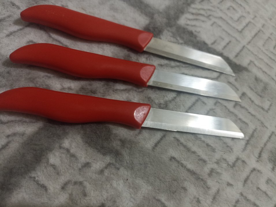 Kırmızı saplı, gri renkli bıçaklardan oluşan kesme seti. Saplar sağlam tutuş sağlar.