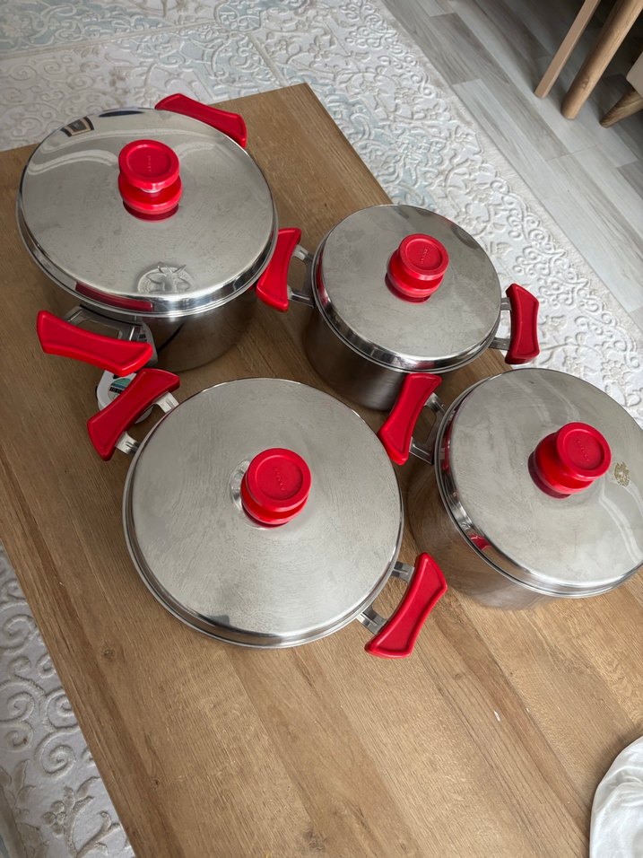 Çeşitli boylarda, kırmızı saplı ve kapaklı paslanmaz çelik tencere seti.