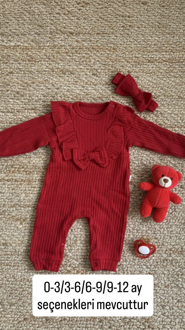 Uzun kollu, fırfırlı kırmızı örgü bebek kız tulumu ve uyumlu saç bandı. Yumuşak ve rahat, hassas ciltler için uygun. 0-3/9-12 ay seçenekleri mevcuttur. Lütfen alırken tercihinizi belirtiniz