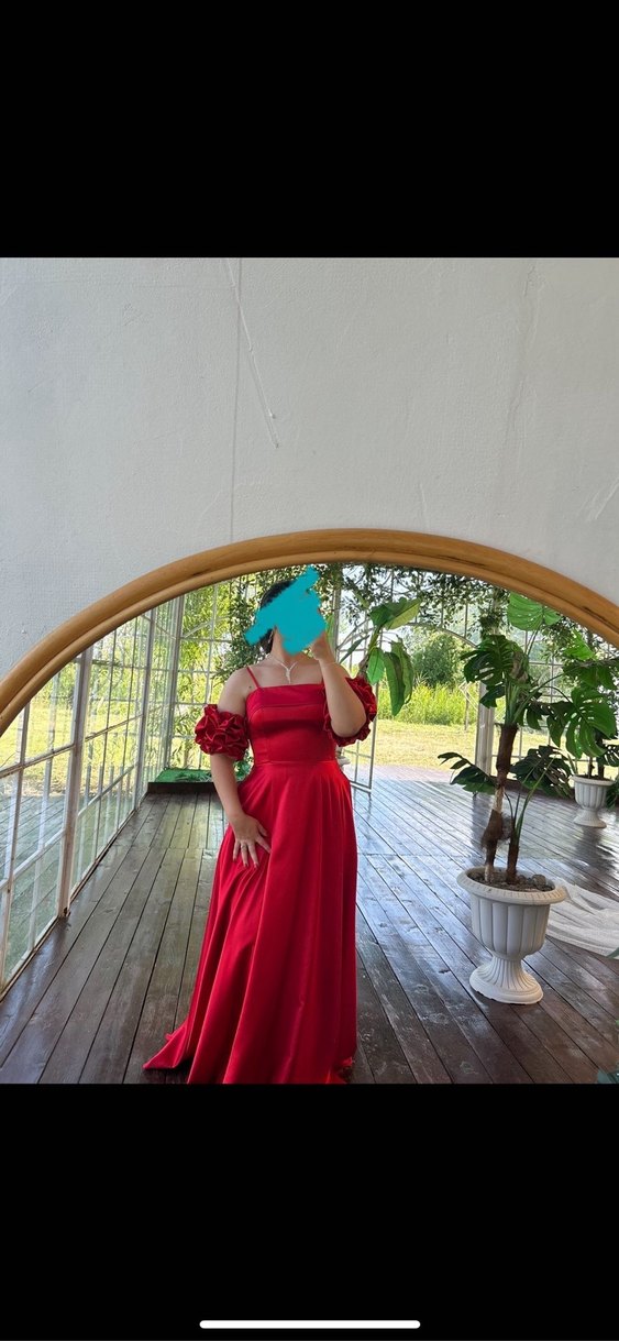 Kırmızı, straplez yakalı, drapeli detaylı, kolsuz ve parlak dokulu midi boy, vücuda oturan kadın abiyesi.