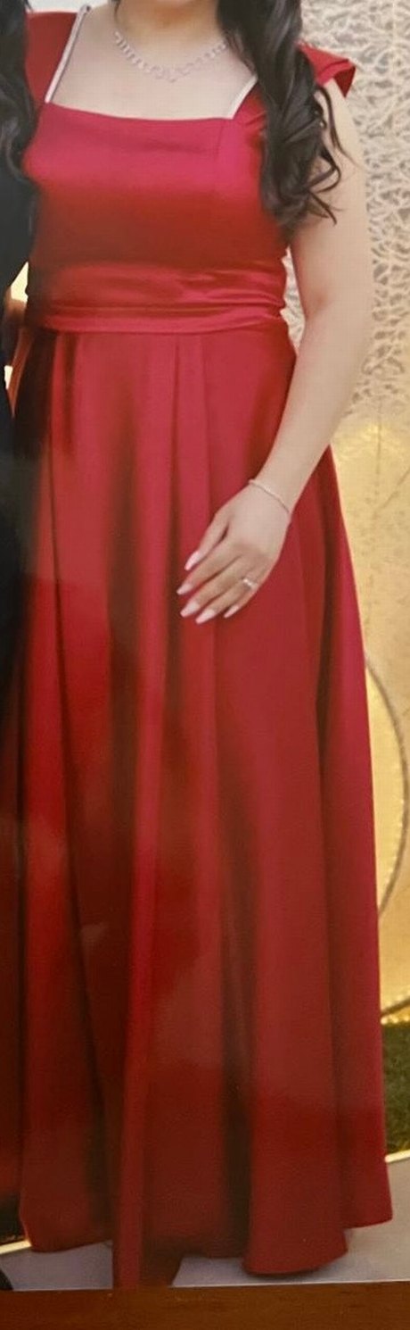 Uzun, kırmızı, kare yaka taşlı omuz detaylı abiye elbise. Parlak canlı kırmızı saten. 2 saat giyildi.