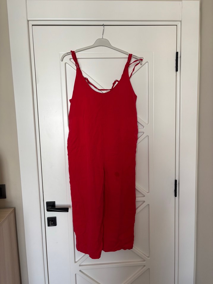 Kırmızı parlak saten kumaştan, askılı, V yakalı, bol kesim ve drapeli tulum. Minimalist ve avangart sokak stili için uygundur.Ürünün hiçbir kusuru yoktur.Fotoğrafta ön kısmında ıslaklık gözükmüş o ıslak mendille sildiğim için ıslak görüntü var.Ürün tertemizdir.Hemen kargolanır.