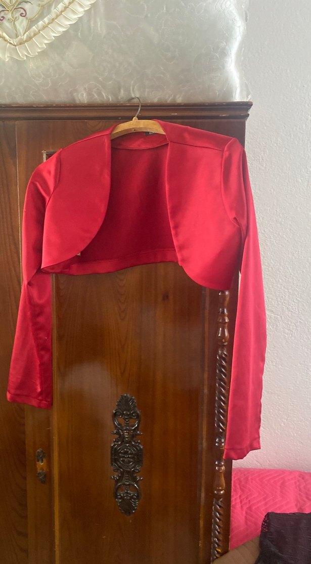 için kırmızı, parlak saten kumaştan, yakası kesimli, uzun kollu, oturan ve drapeli bolero.