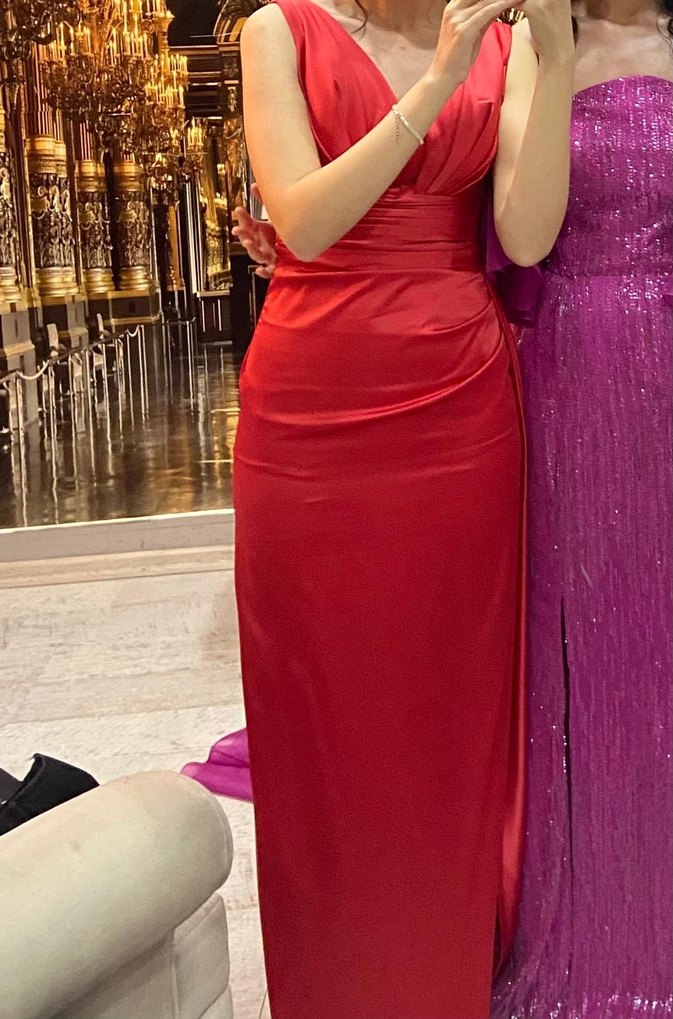 Drapeli, ve kolsuz tasarıma sahip, parlak kırmızı kumaştan yapılmış, saten abiye elbise. 1 kere giyildi marka temsili