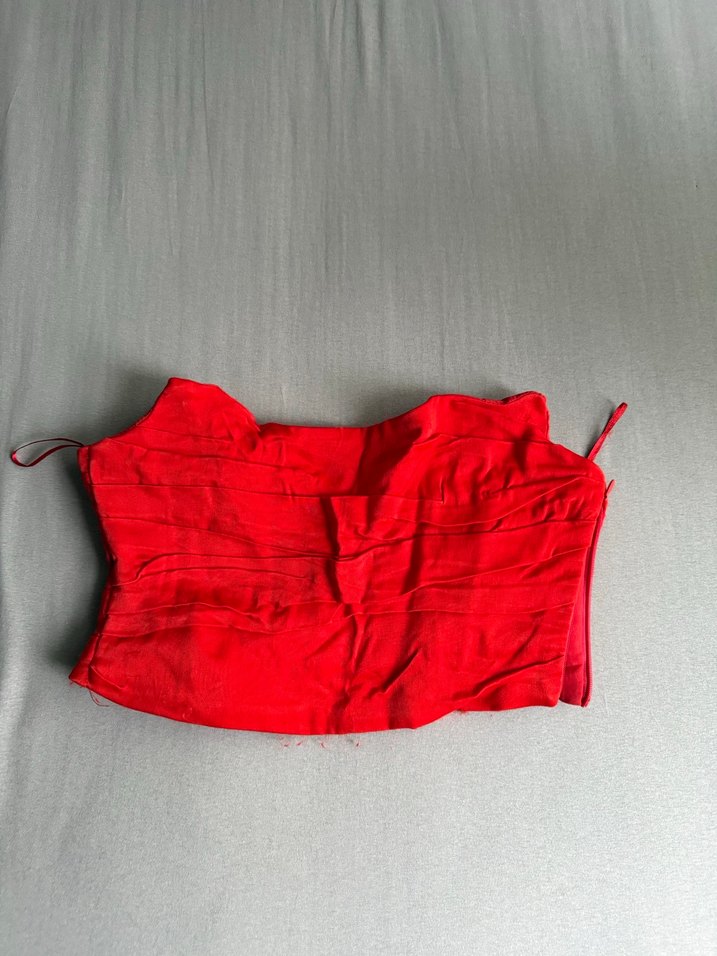 Keten kumaştan, drapeli ve kayık yaka kırmızı büstiyer. Kolsuz ve vücuda oturan kesimiyle parlak bir görünüme sahiptir. Minimalist ve avangart tarz için uygundur.