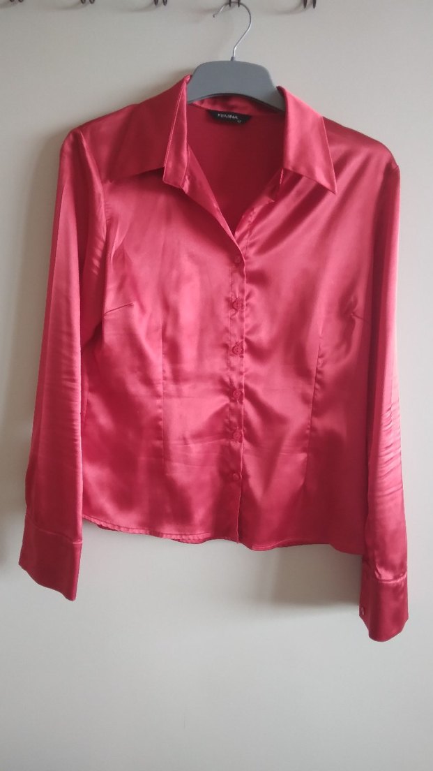 Uzun kollu, gömlek yakalı ve düğmeli, kırmızı parlak saten kumaştan yumuşak üretilmiş, iş ortamına uygun, vücuda oturan kadın gömleği.