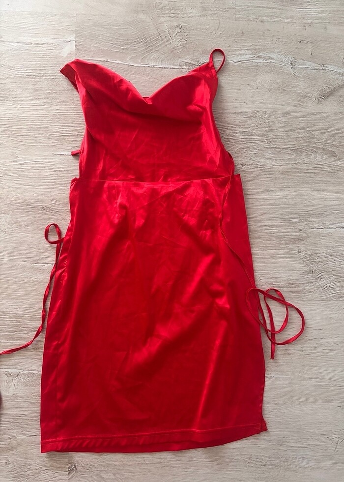 Kırmızı degaje yaka mini saten elbise sırtı açık boyu 75 cm