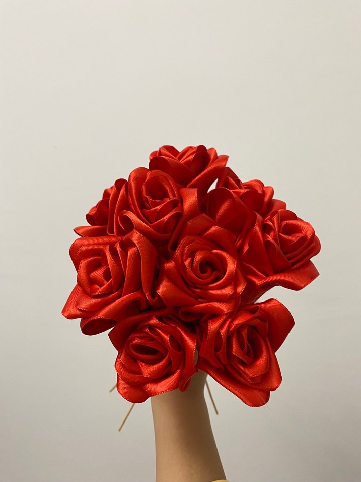 Canlı kırmızı renkte, saten kurdeleden yapılmış gül 9gül tane fiyatıdır