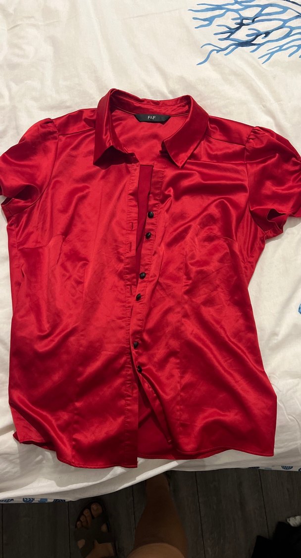 Kırmızı saten kumaştan, kısa kollu ve yakalı, düğmeli, vücuda oturan midi uzunlukta kadın gömleği. Romantik akşamlar için uygun. ❤️