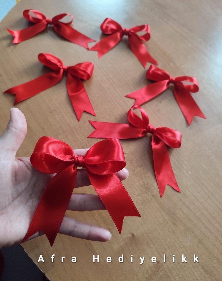 3 cm kalınlıkta kurdeleden yapıldılar. 15 adet fiyatıdırHızlı kargo. Fiyonk eni 10 cm dir. İsteğe göre küçük kalp inci ekleyebilirim. İstediğiniz sayıda da almak için ilan açtırabilirsiniz.Tane fiyatı 9₺ dir.