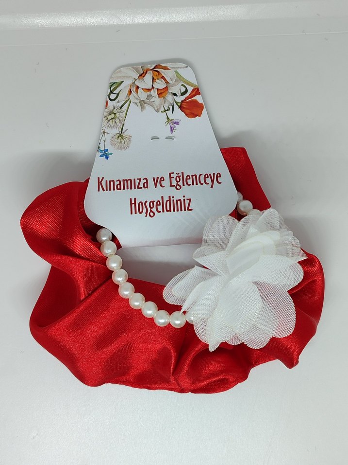 Kırmızı saten elastik tokada beyaz çiçek ve inci detayları bulunur. "Kınamıza ve Eğlenceye Hoşgeldiniz" yazısı vardır. Zarif ve parlak bir tasarım.