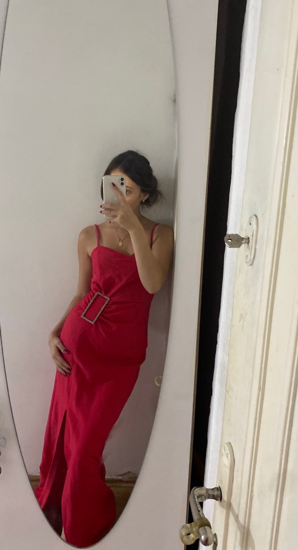 İnce askılı ve yırtmaçlı, parlak saten kumaştan yapılmış kırmızı dar kesim midi elbise, romantik akşamlar için uygundur. Etiketli