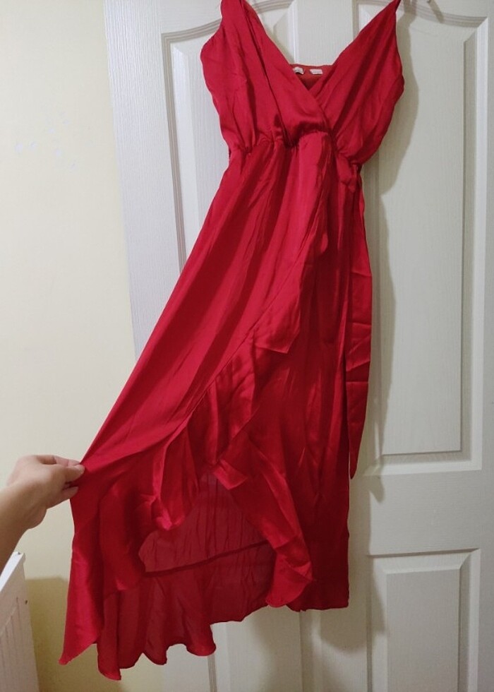 Kırmızı saten midi elbise