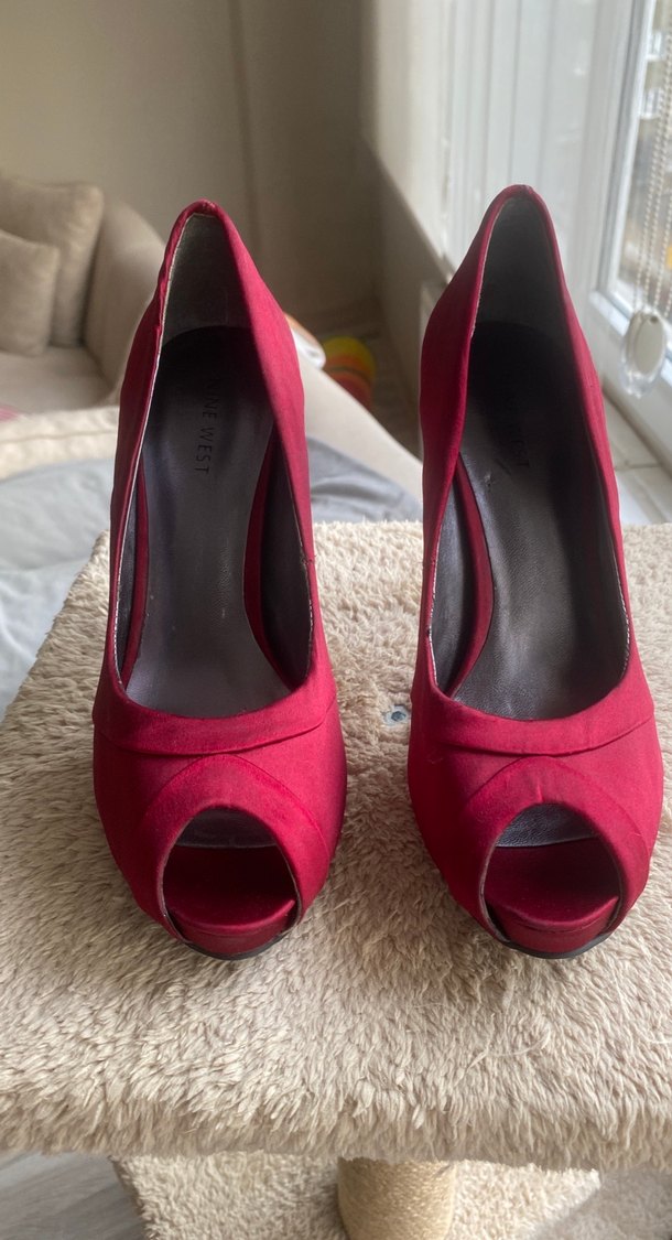 Kırmızı saten, parlak ve pile detaylı stiletto. Platform topuklu, klasik ve çağdaş tarzda, romantik akşamlar için ideal. Özel davetlerde ve şık kombinlerde çok zarif durur. • Topuklu, peep-toe (açık burun) model • Süet dokusu yumuşak ve rengi canlı • Az kullanılmış, genel durumu iyi • Topuk ve taban sağlam •Temiz kullanılmıştır, detaylar fotoğraflarda görülebilir. •Topuğu 8 cm