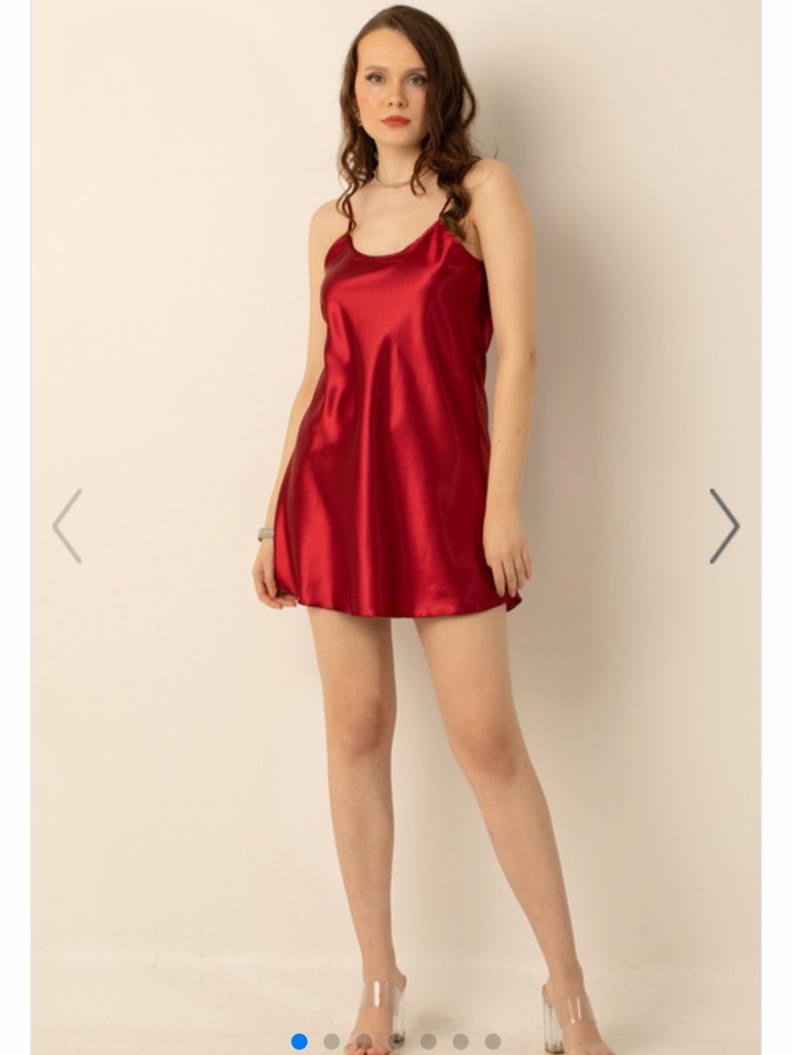 Kırmızı, saten midi gecelik, ince askılı ve V yakalıdır. Rahat kesimi ve parlak dokusuyla romantik akşamlar için şık ve sade bir tercih sunar.