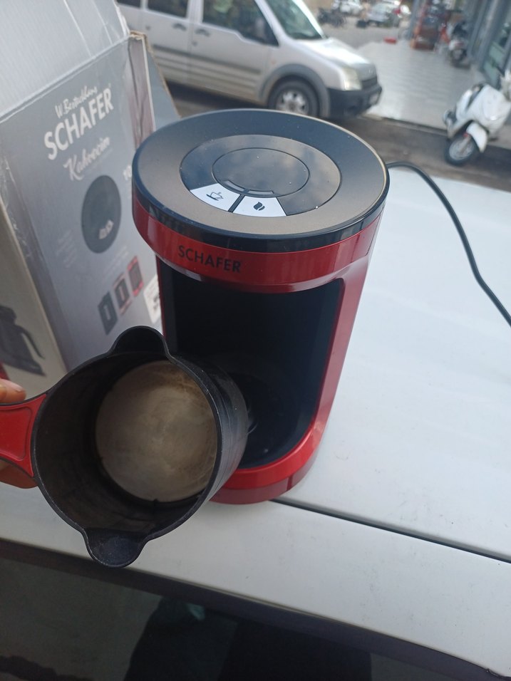 Temiz kahve makinası, gelen gıdenımız olmadığı için pek kullanılmadı...Schäfer kahve makinesi, koyu kırmızı gövde ve üstte kullanımı kolay düğmelerle dikkat çeker. Çıkarılabilir filtre tutucusu ile pratik kahve yapma sağlar. ☕