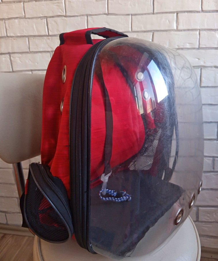 Kırmızı, şeffaf ön paneli ve havalandırma delikleriyle nefes alabilir evcil hayvan taşıma sırt çantası .