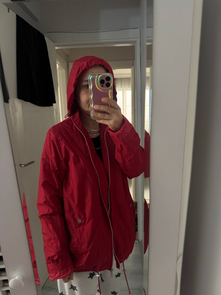 Kırmızı, parlak, şeffaf ve polar dokulu midi boy yağmurluk, yüksek yakalı ve uzun kolludur. Salaş kesimiyle günlük sokak stiline uygundur. ️