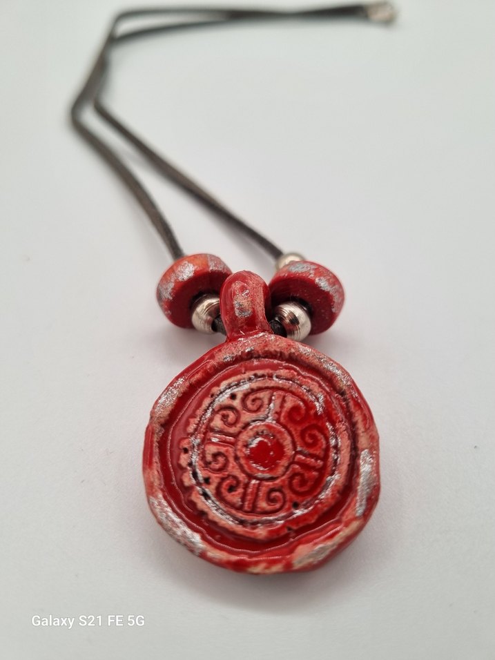 Seramikten yapilmistir. Ozel tasarimdir. Tek adet uretilmistir. Eskitme efekti uygulanmistir. Kısa uzunlukta, renkli kırmızı etnik desenli ve ahşap boncuklu kadın kolyesi, vintage bohem tarzını yansıtır. Günlük kullanım için uygundur. Detaylar fotograflardadır.