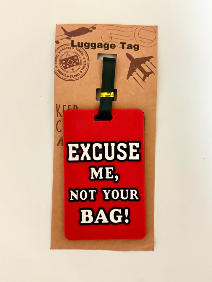 Canlı kırmızı renkte, üzerinde beyaz büyük harflerle 'EXCUSE ME, NOT YOUR BAG!' yazan bagaj etiketi. ✈️