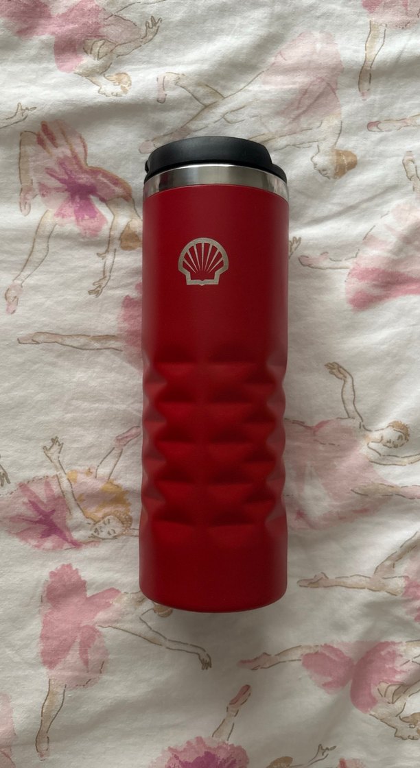 Kabartmalı gövdesi ve siyah kapağı olan kırmızı Shell termos bardak. İçecekleri sıcak veya soğuk tutar. ☕️ hiç kullanılmadı