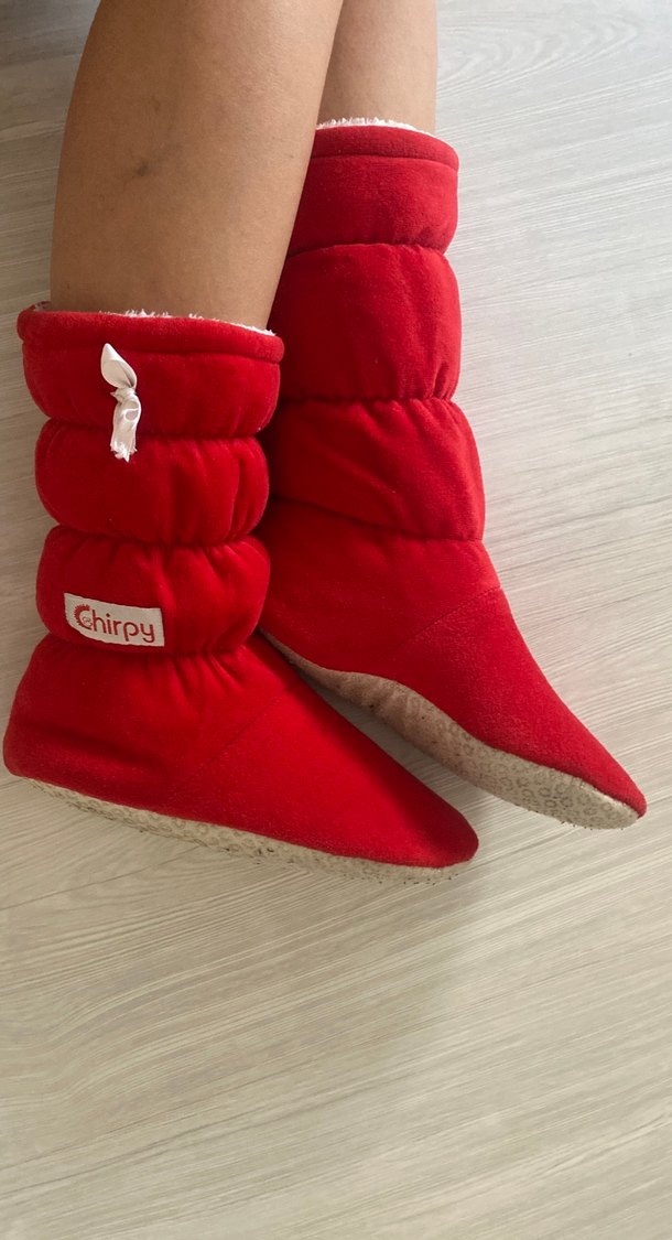 Kızlar için kırmızı, yumuşak fleece kumaşlı, velcro kapamalı sıcak terlikler. Basit ve renkli tasarıma sahip, "Chirpy" markalı terlikler.