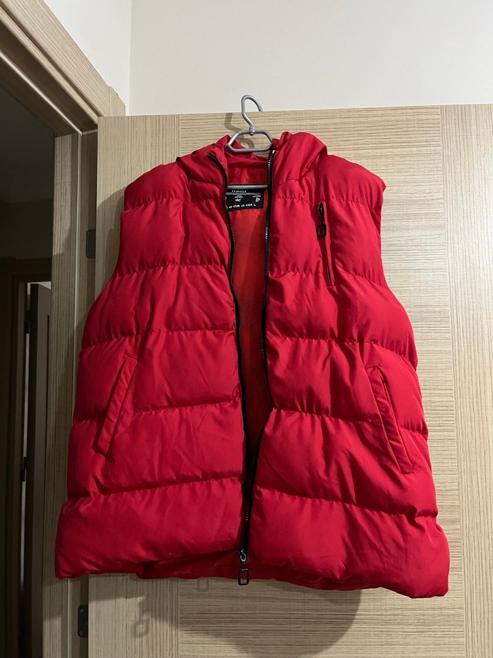 Kırmızı, kolsuz, yüksek yakalı, fermuarlı cepleri olan şık ve parlak kadın yelek. Günlük kullanıma uygun, vücuda oturan normal boyda bir tasarım.