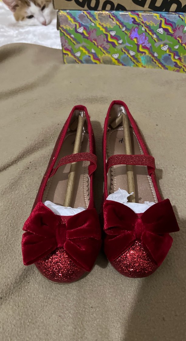 Parlak kırmızı kadife kumaştan yapılmış, büyük fiyonk detaylı, modern tarzda kız babetleri.