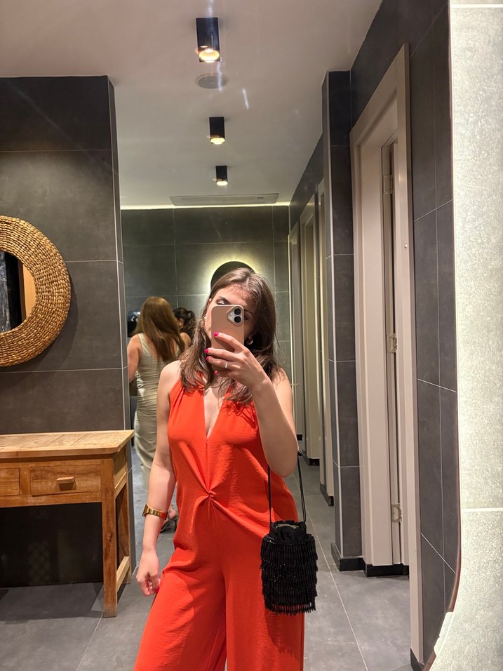 Kırmızı sırt dekolteli Midi Kadın Tulum