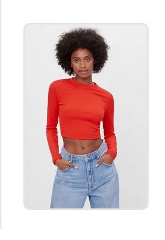 Kırmızı, sade ve parlak denim kumaştan, uzun kollu ve yuvarlak yakalı ince kesim crop bluz. Bikez giyildi