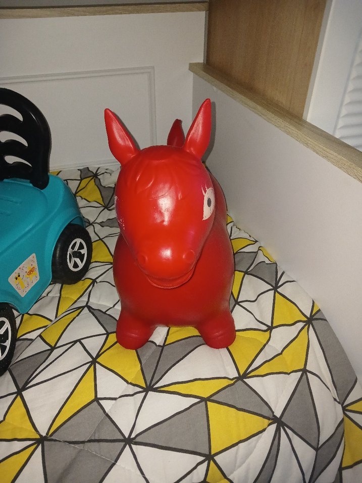 Çocuklar için yumuşak malzemeden yapılmış renkli kırmızı şişme oyuncak at.