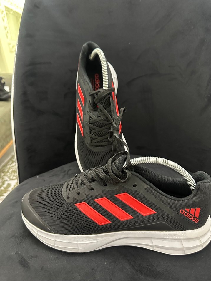 Koyu kırmızı ve siyah renklerde, baskılı detaylı Adidas erkek koşu ayakkabısı. Kauçuk tabanlı ve cırt cırtlı, spor ve sokak stilini birleştirir. adidas lightmotıon ayakkabı 42 numara tek