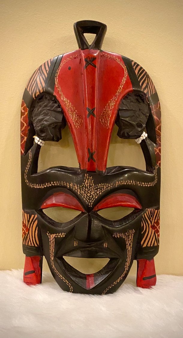 Kırmızı ve siyah renklerde, el işçiliğiyle yapılmış ahşap Afrika maskı. Detaylı desenlere sahip dekoratif bir üründür. Orijinal Kenya elyapımı 24 cm masai kabilesi savaşçı maskı Lütfen güncel fiyatını araştırın Koleksiyonerlerin kaçırmaması gereken nefis bir parça
