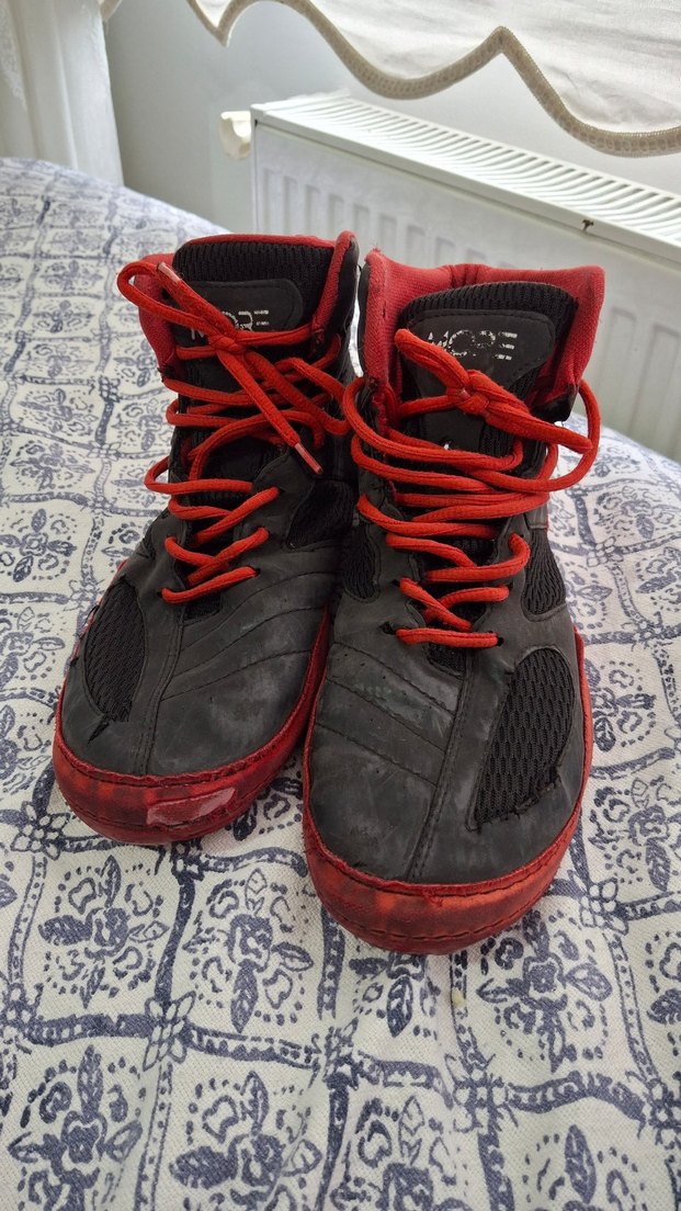 Kırmızı ve siyah renkte, bağcıklı, kauçuk tabanlı güreş ayakkabısı, rock punk tarzıyla athleisure stilinde.43.5 numara